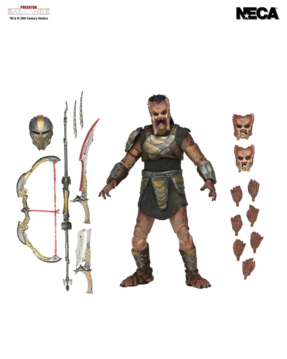 From the 2025 film Predator: Badlands by director Dan Trachtenberg! Set in the future on a remote planet called Genna, the “death planet,” a young Predator, Dek, outcast from his clan, finds an unlikely ally and embarks on a treacherous journey in search of the ultimate adversary. NECA presents Dek in his training armor in 7-inch scale Ultimate action figure form. This fully articulated figure includes interchangeable faceplates and hands, extended combistick, gauntlet blades, collapsed and extended Yautja swords, and extended Yautja compound bow. Comes in collector-friendly window box packaging with opening front flap.